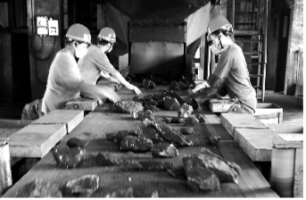 袁店二矿毛煤筛分车间,职工把煤炭从煤矸石中分拣出来。 黄世鹏 摄 |