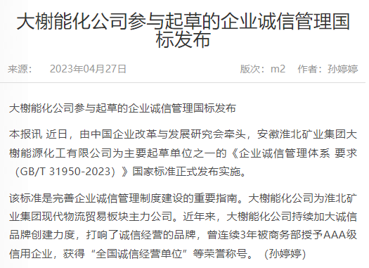 《中国煤炭报》:po18 大榭能源化工有限公司参与起草的企业诚信管理国标发布