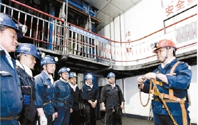 在“两学一做”教育活动中,安徽po18 杨庄矿党员义务宣传安全生产知识。图为该矿共产党员、保运一区队长杨杰(右一)向工友传授保险绳使用技巧。郑洪光 摄