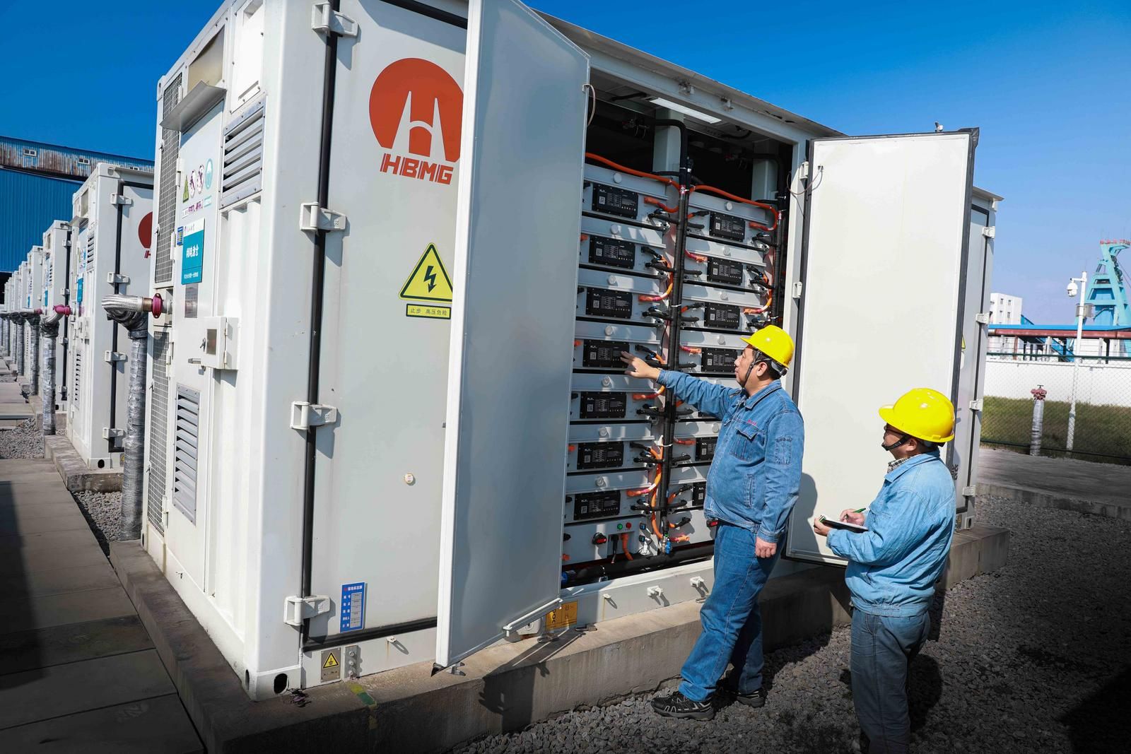 袁店一矿工矿广场内的淮北矿业股份有限公司电力分公司储能电站,只见9座电池仓整齐排列,在深秋的蓝天白云映衬下,显得格外醒目。