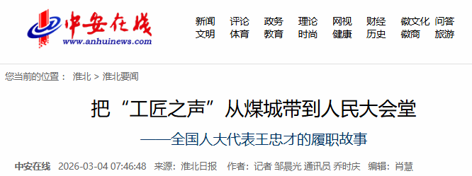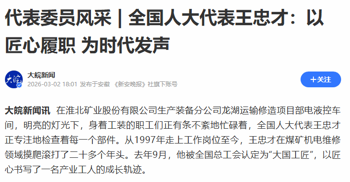 “从一线工匠到全国人大代表,身份的转变,意味着更大的责任。”王忠才表示,未来他将继续扎根煤矿一线,传承工匠精神、深耕技术创新,同时认真履行代表职责,持续关注技能人才成长与资源型城市转型,多听一线声音、多提务实建议,以实干践行初心,以匠心赋能发展。(张骅 吴明 彭学英)