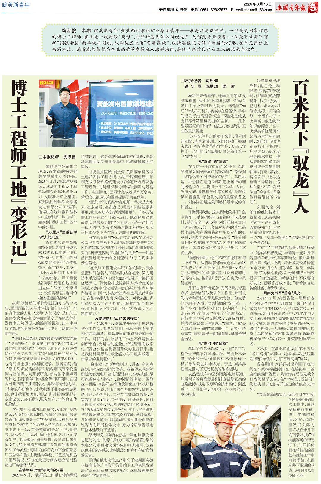 青年——李海洋与刘洋洋。一位是走出象牙塔的博士工程师,在工地一线历经“变形”,将科研基因注入传统电厂,为智慧未来筑基;一位是百米井下守护“钢铁动脉”的单轨吊司机,从学徒成长为“首席高徒”,以精湛技艺与修旧利废的巧思,在平凡岗位上书写不凡。用青春与智慧为企业高质量发展注入澎湃动能,展现了新时代产业工人的风采与担当。