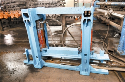 童亭矿技术人员自制了钢带取直器。技术人员把一块厚钢板作为底座,在钢板两侧按照钢带的弯曲度挖两个凸槽,并在中线位置挖一个凹槽作为钢带的塑形支撑点,利用油缸的伸缩,即可取直钢带,达到塑形目的。