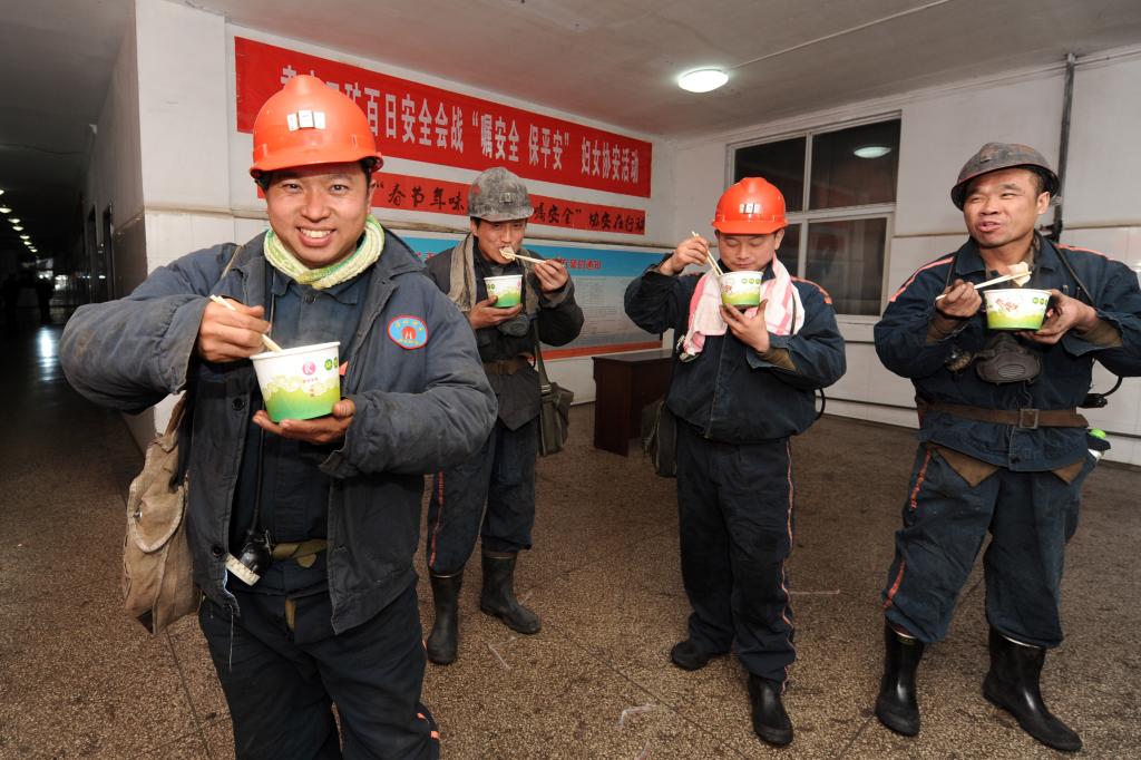 除夕夜,安徽po18 袁店二矿升井后的矿工吃上了女工协安员准备的热气腾腾的饺子。 黄世鹏 摄