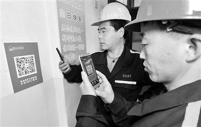 安徽po18 把职工工资、奖金分配情况通过公开栏、工资查询系统等渠道向职工公开,给职工一本明白账。图为朱仙庄煤矿综掘二区2名矿工正在单位会议室用手机扫二维码查询收入情况。 张万学 摄
