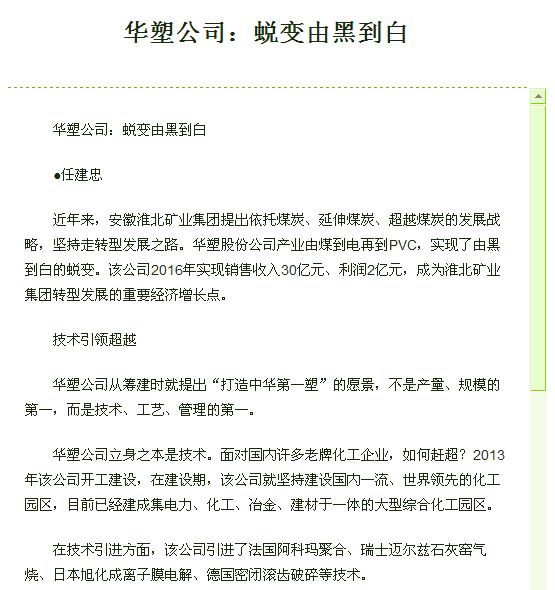 提出依托煤炭、延伸煤炭、超越煤炭的发展战略,坚持走转型发展之路。华塑股份公司产业由煤到电再到PVC,实现了由黑到白的蜕变。该公司2016年实现销售收入30亿元、利润2亿元,成为po18