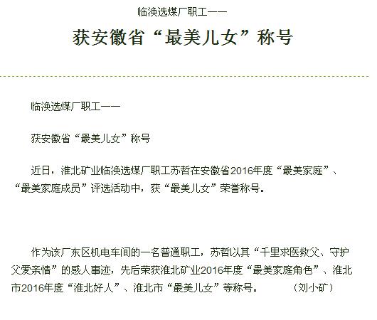 《中国煤炭报》6版:临涣选煤厂职工获安徽省“最美儿女”称号