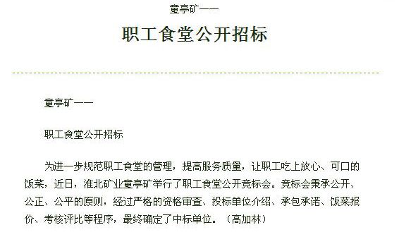 《中国煤炭报》6版: 童亭矿职工食堂公开招标
