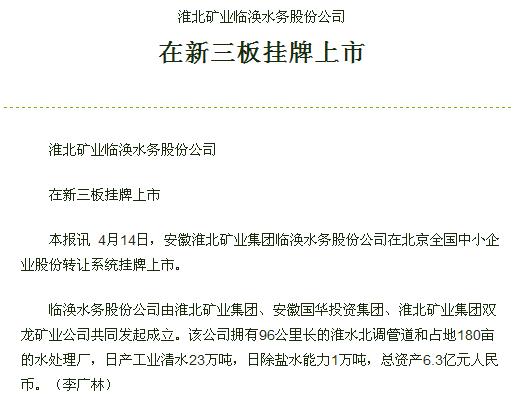 《中国煤炭报》2版:淮北矿业临涣水务股份公司在新三板挂牌上市
