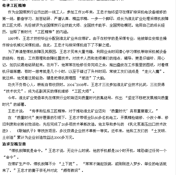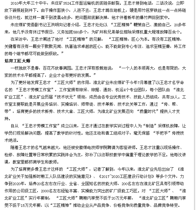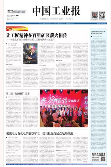 《中国工业报》1版头条:让工匠精神在百里矿区薪火相传