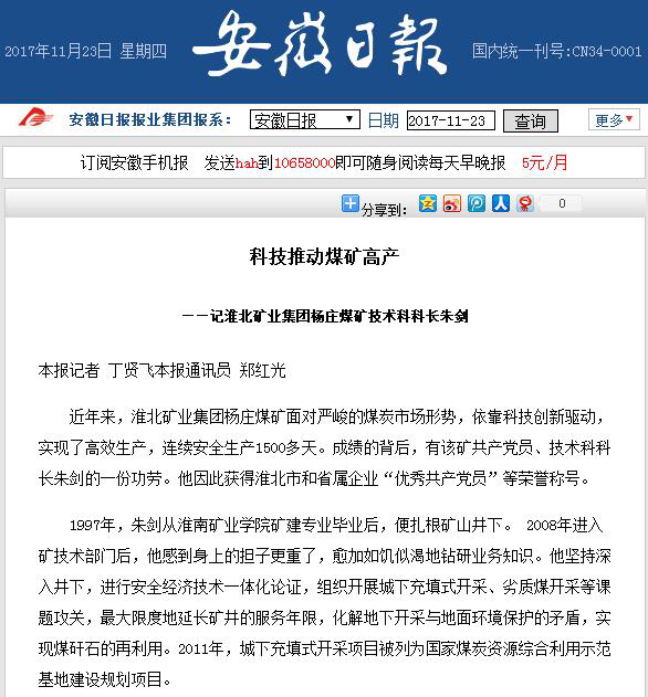 杨庄煤矿面对严峻的煤炭市场形势,依靠科技创新驱动,实现了高效生产,连续安全生产1500多天。成绩的背后,有该矿共产党员、技术科科长朱剑的一份功劳。他因此获得淮北市和省属企业“优秀共产党员”等荣誉称号。