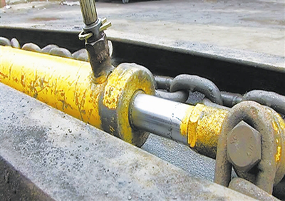 该矿技术人员自制了一个链板机液压紧链器。该装置由手动液压泵、换向阀、液压管路、连接链环等部件组成,采用手动操作,液压推杆推力大,行程长,能够一次满足紧链要求。