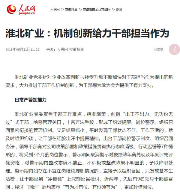 淮北矿业党委聚焦干部工作难点,精准施策,剑指“出工不出力、无功也无过”式干部,前移管理关口,丰富方法手段,形成了约谈提醒、岗位警示、组织召回紧密衔接的管理机制。立足抓早抓小,平时发现干部状态不佳、工作下滑的,就及时组织约谈,让干部在红脸出汗中提振精神。出台干部岗位警示制度、组织召回办法,领导干部有对公司决策部署和政策措施贯彻执行态度消极、行动迟缓等7种情形的,将受到3个月的岗位警示,警示期间取消警示对象绩效年薪兑现及年度评先评优资格,对警示期内整改态度不端正、不积极或整改效果不明显的,予以降职处理。警示期内如存在不宜在岗继续履职情况的,直接予以组织召回,只发放基本生活费,让干部坐到“冷板凳”上深刻反省检讨。近两年,先后有9名领导干部被召回,经过“回炉”后均表示“有为才有位、有位须有为”,更加珍惜岗位。