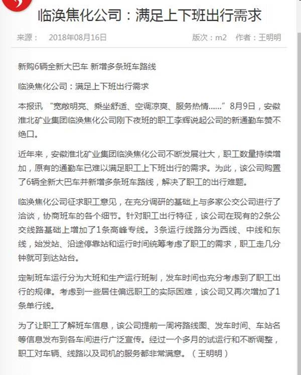 《中国煤炭报》:临涣焦化公司满足职工上下班出行需求