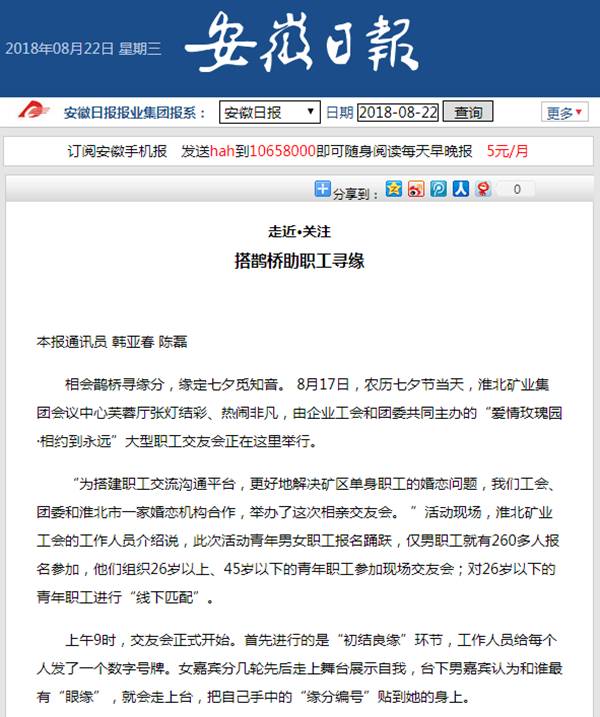 “为搭建职工交流沟通平台,更好地解决矿区单身职工的婚恋问题,我们工会、团委和淮北市一家婚恋机构合作,举办了这次相亲交友会。”活动现场,淮北矿业工会的工作人员介绍说,此次活动青年男女职工报名踊跃,仅男职工就有260多人报名参加,他们组织26岁以上、45岁以下的青年职工参加现场交友会;对26岁以下的青年职工进行“线下匹配”。