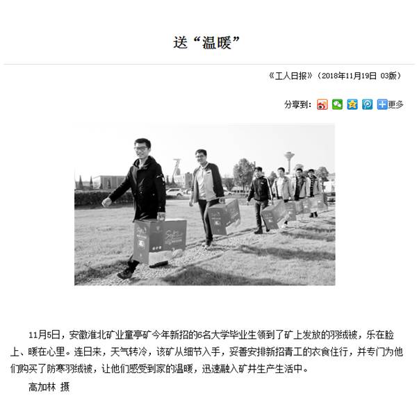 《工人日报》:童亭矿为新招大学毕业生送“温暖”