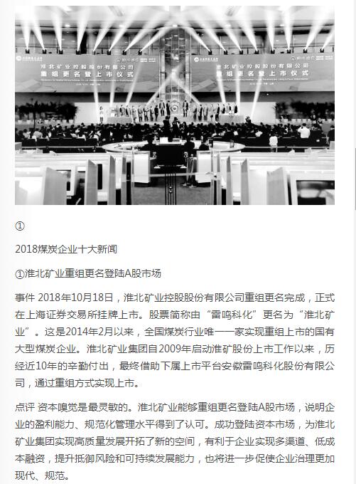 事件 2018年10月18日,淮北矿业控股股份有限公司重组更名完成,正式在上海证券交易所挂牌上市。股票简称由“雷鸣科化”更名为“淮北矿业”。这是2014年2月以来,全国煤炭行业唯一一家实现重组上市的国有大型煤炭企业。po18