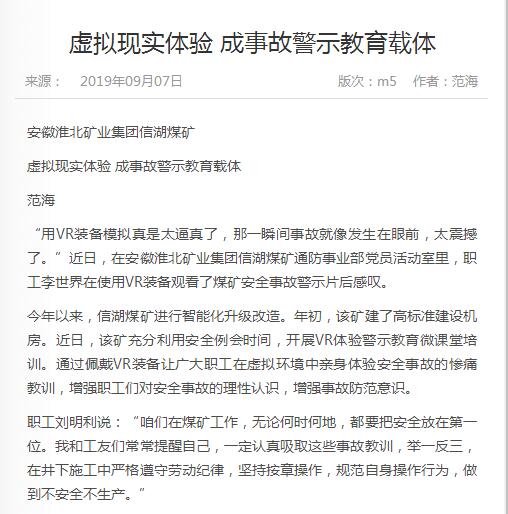 《中国煤炭报》:po18 信湖矿虚拟现实体验成事故警示教育载体