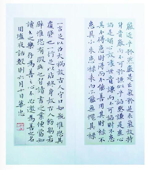 为了达到精神与书法的融会贯通,屈华忠以超常的毅力克服着常人难以承受的困难。一坐就是两三个小时,时间久了,他得了腱鞘炎,手腕也磨红了、肿了,执笔的手指磨出了厚厚的硬茧。而他的笔法也越发显得刚劲有力,运笔也更奔放自如了。尤其他的小楷,既有魏晋之风,又具明清之意。他的行书书风则取法二王一路,用笔较灵活多变,厚重不失飘逸,灵动不失法度!