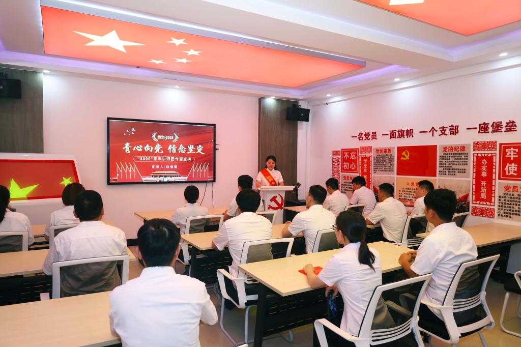 “在中国共产党的领导下,中国发生了翻天覆地的变化,从一盘散沙到钢铁一块,这是组织的力量,更是灵魂深处的信仰。”7月1日当天,该矿“8090”宣讲团成员赵佳莉结合中国共产党一百余年来的成长历程向与会青年认真讲述。
