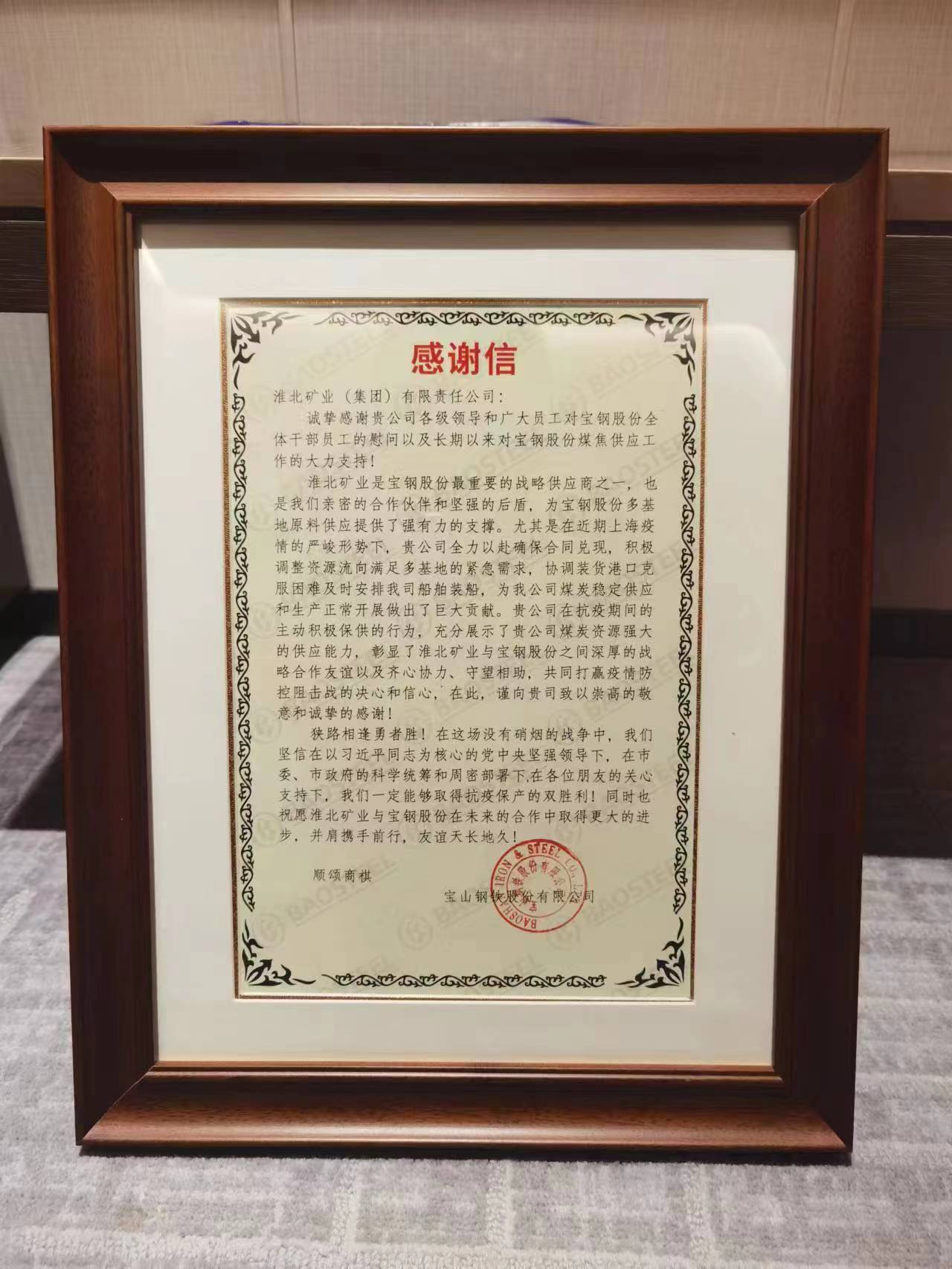 “贵公司在抗疫期间的主动积极保供的行为,充分展示了贵公司煤炭资源强大的供应能力,彰显了淮北矿业与宝钢股份之间深厚的战略合作友谊以及齐心协力、守望相助,共同打贏疫情防控阻击战的决心和信心,在此,谨向贵司致以崇高的敬意和诚挚的感谢!”