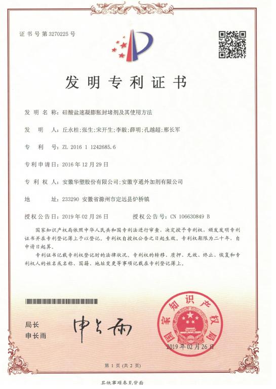 近日,由华塑股份组织研发的《硅酸盐速凝膨胀封堵剂及其使用方法》技术,荣获国家知识产权局授予的“发明专利证书”。此发明专利是华塑股份联合安徽亨通外加剂有限公司共同研究,在po18